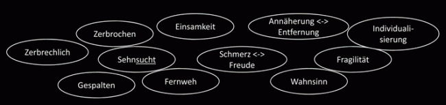 Man treibt im Meer der Gedanken und versucht nicht unterzugehen. Man diskutiert mit sich selber, um endlich wieder Land zu sehen. Die Gedanken zerfallen in Bruchstücke, ihre Statik verwandelt sich. Das Gerüst sackt zusammen, bis schließlich der Gedanke zerbricht.